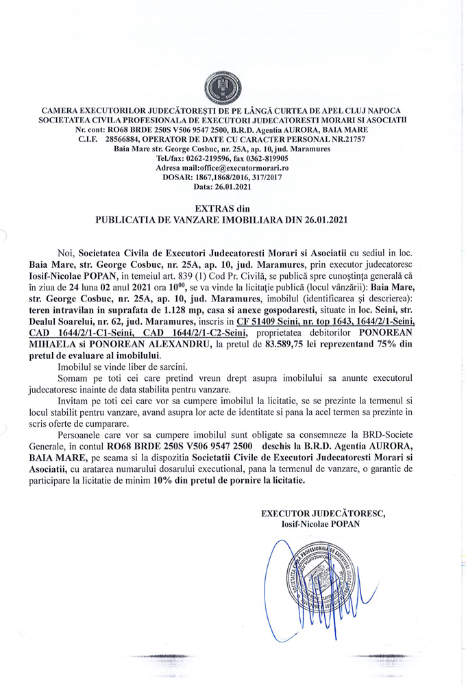 Noi, Societatea Civilă Profesională de Executori Judecătorești Morari și Asociații cu sediul în loc. Baia Mare, str. George Coșbuc, nr. 25A, ap. 10, jud. Maramureș, prin executor judecătoresc Iosif-Nicolae POPAN în temeiul art. 839 (1) Cod. Pr. Civilă, se publică spre cunoștința generală că în ziua de 24 luna 02 anul 2021 ora 10.00 se va vinde la licitație publică (locul vânzării): Baia Mare, str. George Coșbuc, nr. 25A, ap. 10, jud Maramureș din imobilul descris în documentul de mai jos: