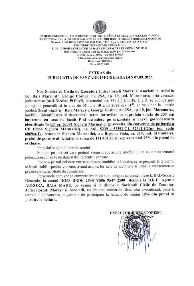 Noi, Societatea Civilă Profesională de Executori Judecătorești Morari și Asociații cu sediul în loc. Baia Mare, str. George Coșbuc, nr. 25A, ap. 10, jud. Maramureș, prin executor judecătoresc Iosif-Nicolae POPAN, în temeiul art. 839 (1) Cod. Pr. Civilă, se publică spre cunoștința generală că în ziua de 06 luna 10 anul 2022 ora 11.00, se va vinde la licitație publică (locul vânzării): Baia Mare, str. George Coșbuc, nr. 25A, ap. 10, jud Maramureș, imobilul descris în documentul de mai jos: