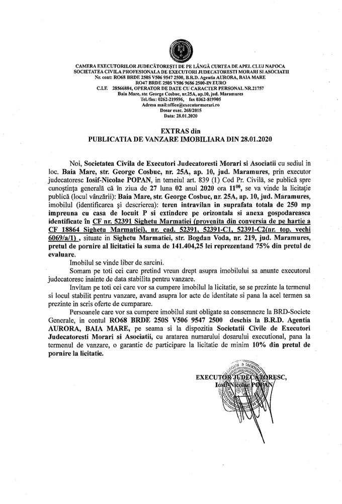 Noi, Societatea Civila Profesionala de Executori Judecatoresti Morari si Asociatii cu sediul in loc. Baia Mare, str. George Cosbuc, nr. 25A, ap. 10, jud. Maramures, prin executor judecatoresc Iosif-Nicolae POPAN, in temeiul art. 839 (1) Cod. Pr. Civila, se publica spre cunostinta generala ca in ziua de 27 luna 02 anul 2020 ora 11.00, se va vinde la licitatie publica (locul vanzarii): Baia Mare, str. George Cosbuc, nr. 25A, ap. 10, jud Maramures, imobilul descris in documentul de mai jos: