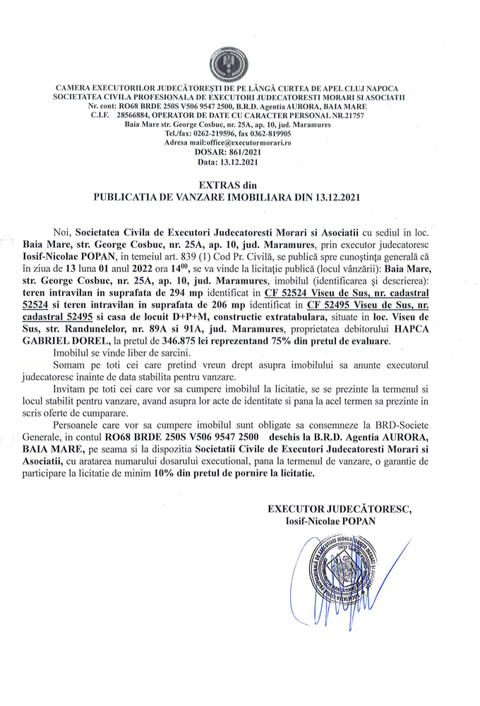Noi, Societatea Civilă Profesională de Executori Judecătorești Morari și Asociații cu sediul în loc. Baia Mare, str. George Coșbuc, nr. 25A, ap. 10, jud. Maramureș, prin executor judecătoresc Iosif-Nicolae POPAN în temeiul art. 839 (1) Cod. Pr. Civilă, se publică spre cunoștința generală că în ziua de 13 luna 01 anul 2022 ora 14.00, se va vinde la licitație publică (locul vânzării): Baia Mare, str. George Coșbuc, nr. 25A, ap. 10, jud Maramureș, imobilul descris în documentul de mai jos: