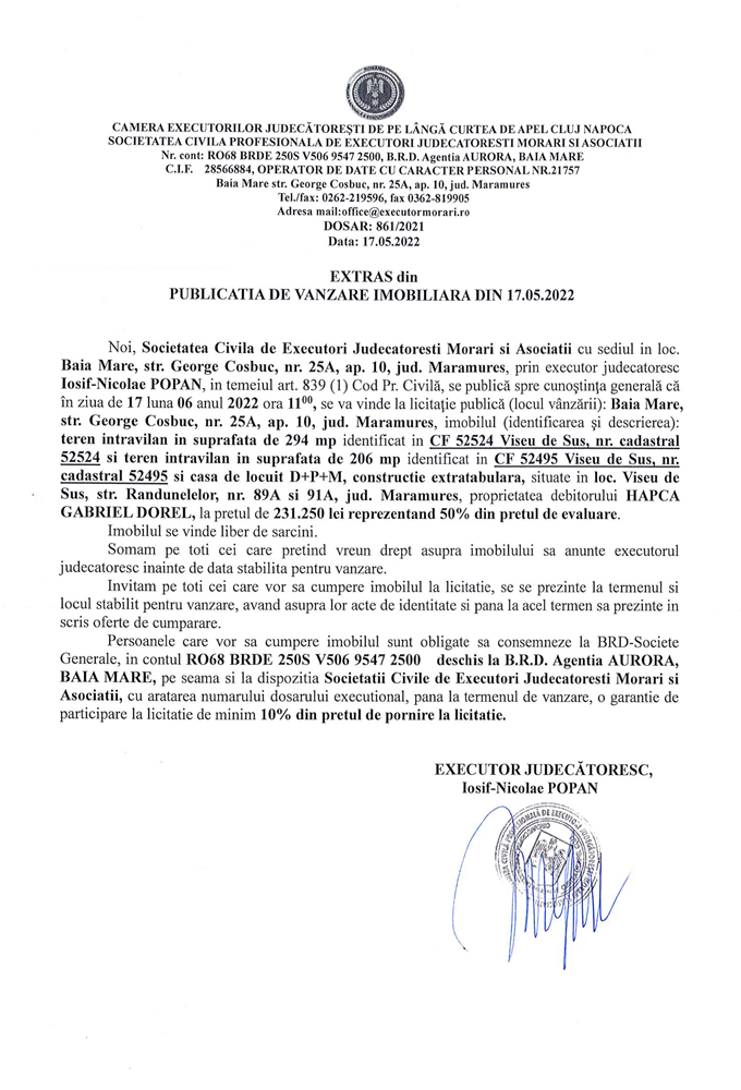 Noi, Societatea Civilă Profesională de Executori Judecătorești Morari și Asociații cu sediul în loc. Baia Mare, str. George Coșbuc, nr. 25A, ap. 10, jud. Maramureș, prin executor judecătoresc Iosif-Nicolae POPAN în temeiul art. 839 (1) Cod. Pr. Civilă, se publică spre cunoștința generală că în ziua de 17 luna 06 anul 2022 ora 11.00, se va vinde la licitație publică (locul vânzării): Baia Mare, str. George Coșbuc, nr. 25A, ap. 10, jud Maramureș, imobilul descris în documentul de mai jos: