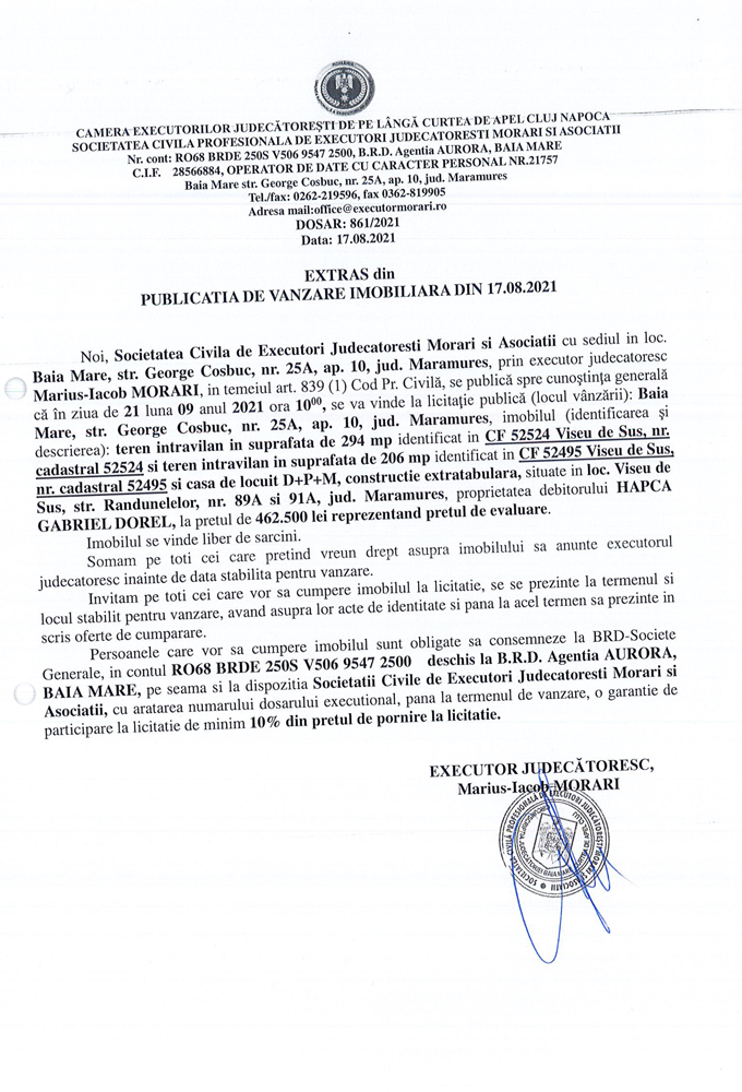 Noi, Societatea Civilă Profesională de Executori Judecătorești Morari și Asociații cu sediul în loc. Baia Mare, str. George Coșbuc, nr. 25A, ap. 10, jud. Maramureș, prin executor judecătoresc Marius-Iacob MORARI în temeiul art. 839 (1) Cod. Pr. Civilă, se publică spre cunoștința generală că în ziua de 21 luna 09 anul 2021 ora 10.00 se va vinde la licitație publică (locul vânzării): Baia Mare, str. George Coșbuc, nr. 25A, ap. 10, jud Maramureș imobilul descris în documentul de mai jos: