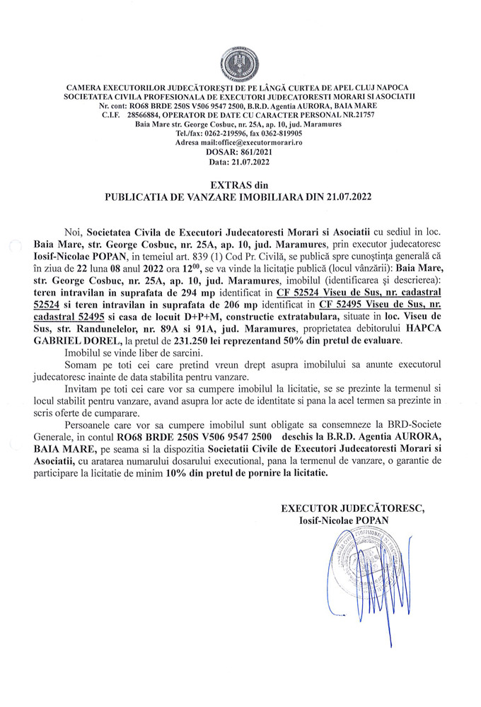Noi, Societatea Civilă Profesională de Executori Judecătorești Morari și Asociații cu sediul în loc. Baia Mare, str. George Coșbuc, nr. 25A, ap. 10, jud. Maramureș, prin executor judecătoresc Iosif-Nicolae POPAN, în temeiul art. 839 (1) Cod. Pr. Civilă, se publică spre cunoștința generală că în ziua de 22 luna 08 anul 2022 ora 12.00, se va vinde la licitație publică (locul vânzării): Baia Mare, str. George Coșbuc, nr. 25A, ap. 10, jud Maramureș, imobilul descris în documentul de mai jos:
