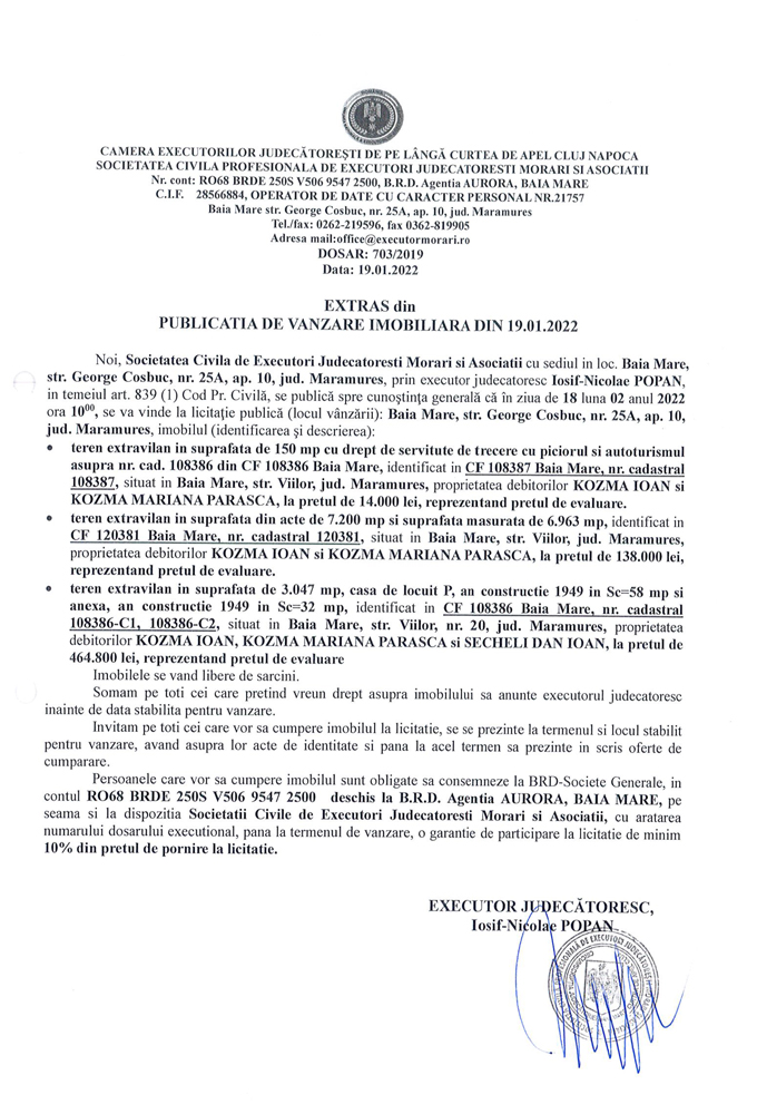 Noi, Societatea Civilă Profesională de Executori Judecătorești Morari și Asociații cu sediul în loc. Baia Mare, str. George Coșbuc, nr. 25A, ap. 10, jud. Maramureș, prin executor judecătoresc Iosif-Nicolae POPAN în temeiul art. 839 (1) Cod. Pr. Civilă, se publică spre cunoștința generală că în ziua de 18 luna 02 anul 2022 ora 10.00, se va vinde la licitație publică (locul vânzării): Baia Mare, str. George Coșbuc, nr. 25A, ap. 10, jud Maramureș, imobilul descris în documentul de mai jos: