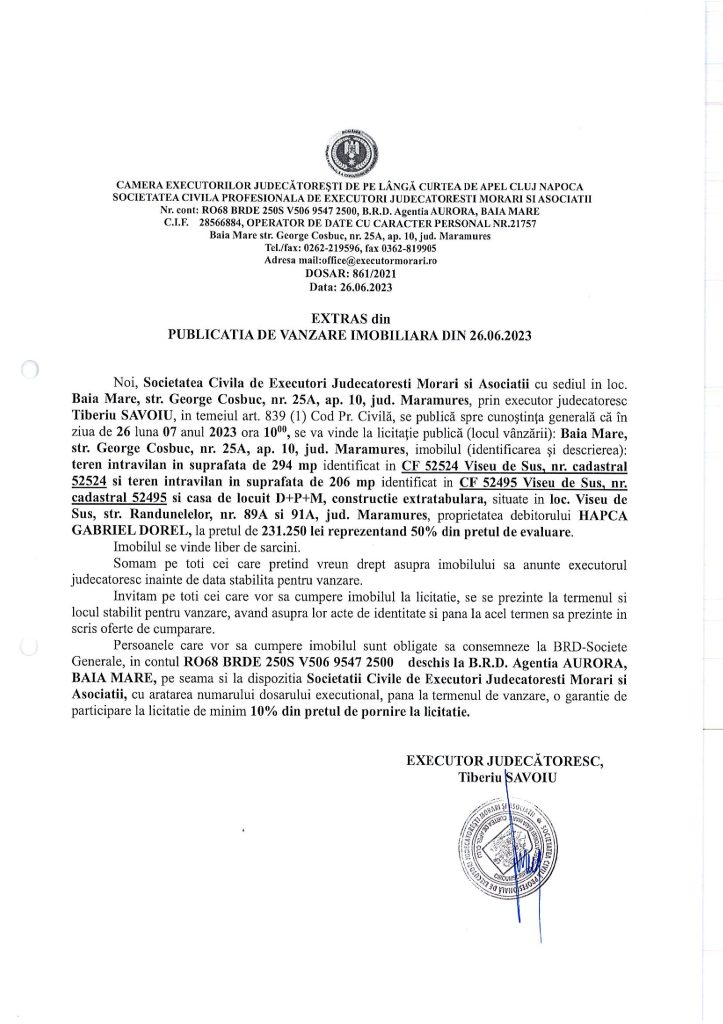 Vânzare casă și terenuri în Vișeu de Sus – Extras publicație imobiliară, din data de 26. 06. 2023