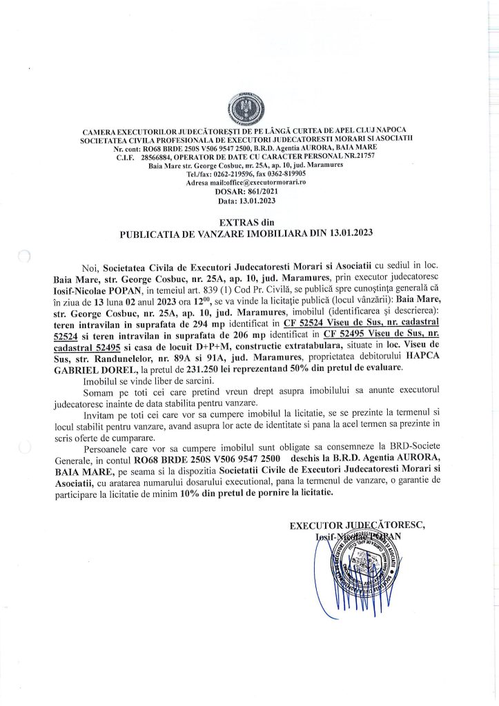 Vânzare casă și terenuri intravilane în Vișeu de Sus – Extras publicație imobiliară, din data de 12. 01. 2023