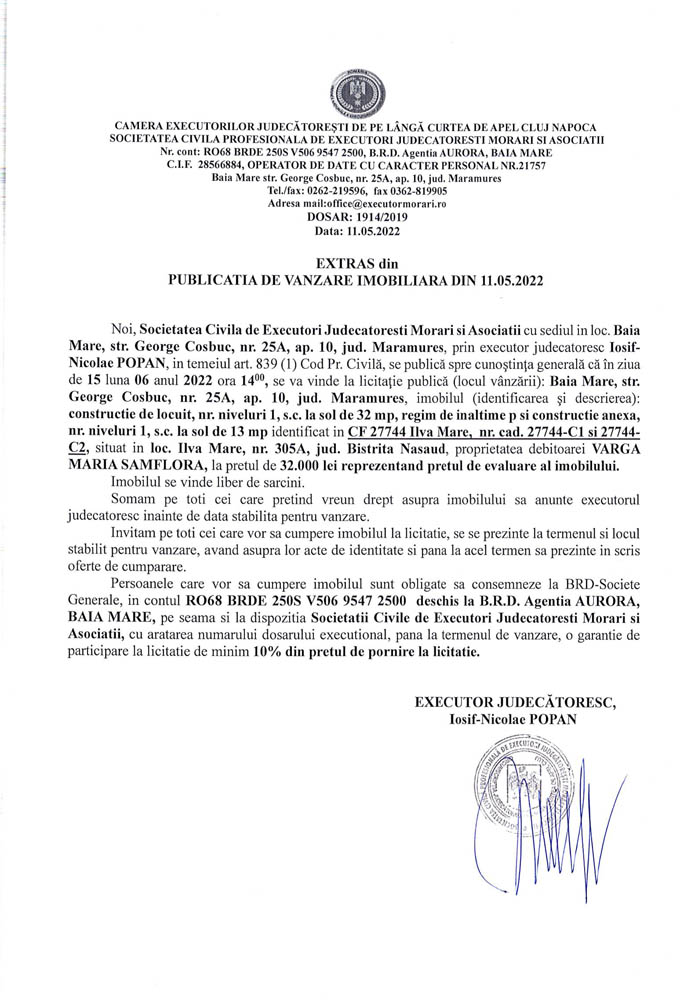 Noi, Societatea Civilă Profesională de Executori Judecătorești Morari și Asociații cu sediul în loc. Baia Mare, str. George Coșbuc, nr. 25A, ap. 10, jud. Maramureș, prin executor judecătoresc Iosif-Nicolae POPAN în temeiul art. 839 (1) Cod. Pr. Civilă, se publică spre cunoștința generală că în ziua de 15 luna 06 anul 2022 ora 14.00, se va vinde la licitație publică (locul vânzării): Baia Mare, str. George Coșbuc, nr. 25A, ap. 10, jud Maramureș, imobilul descris în documentul de mai jos: