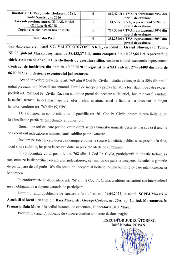 Noi, SOCIETATEA CIVILA PROFESIONALĂ DE EXECUTORI JUDECATOREȘTI MORARI ȘI ASOCIAȚII, cu sediul în loc. Baia Mare, str. George Cosbuc, nr. 25A, ap. 10, jud. Maramures, prin executor judecatoresc Iosif-Nicolae POPAN,