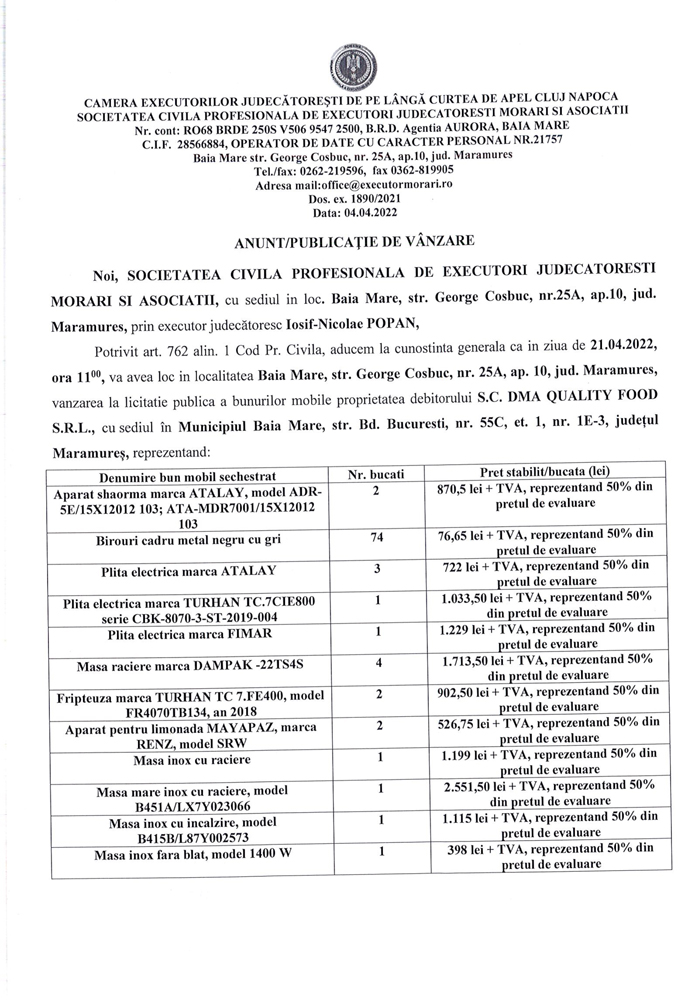 Noi, SOCIETATEA CIVILA PROFESIONALĂ DE EXECUTORI JUDECATOREȘTI MORARI ȘI ASOCIAȚII, cu sediul în loc. Baia Mare, str. George Cosbuc, nr. 25A, ap. 10, jud. Maramures, prin executor judecatoresc Iosif-Nicolae POPAN,