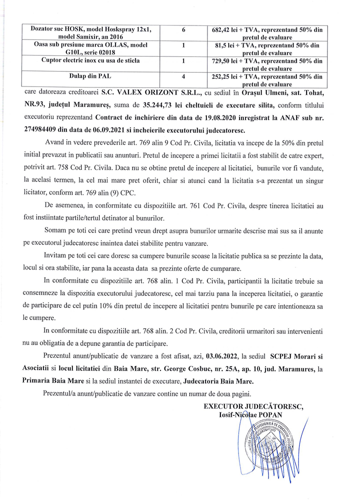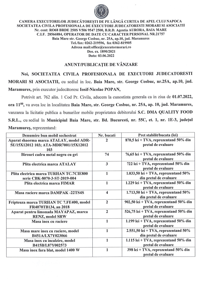 Noi, SOCIETATEA CIVILA PROFESIONALA DE EXECUTORI JUDECATORESTI MORARI SI ASOCIATII, cu sediul in loc. Baia Mare, str. George Cosbuc, nr. 25A, ap. 10, jud. Maramures, prin executor judecatoresc Iosif-Nicoale POPAN,