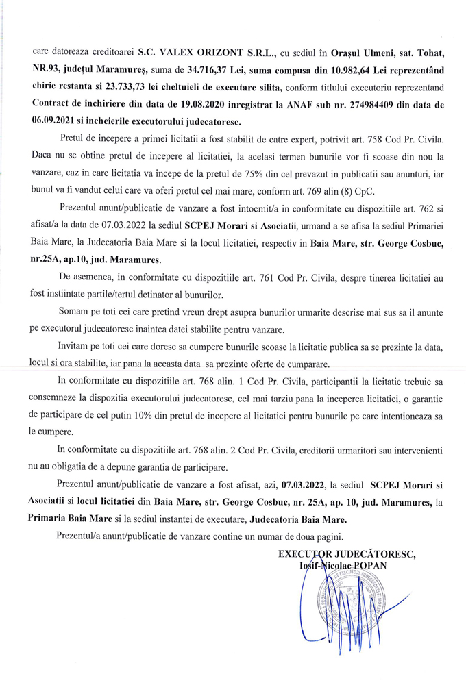 Noi, SOCIETATEA CIVILA PROFESIONALA DE EXECUTORI JUDECATORESTI MORARI SI ASOCIATII, cu sediul in loc. Baia Mare, str. George Cosbuc, nr. 25A, ap. 10, jud. Maramures, prin executor judecatoresc Iosif-Nicoale POPAN,