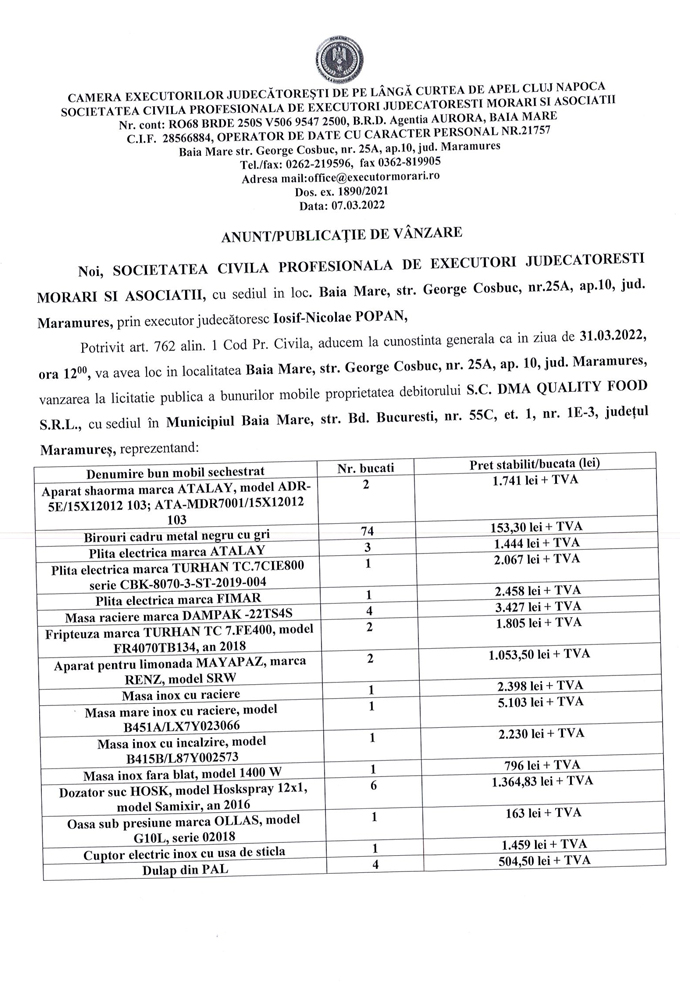 Noi, SOCIETATEA CIVILA PROFESIONALA DE EXECUTORI JUDECATORESTI MORARI SI ASOCIATII, cu sediul in loc. Baia Mare, str. George Cosbuc, nr. 25A, ap. 10, jud. Maramures, prin executor judecatoresc Iosif-Nicoale POPAN,