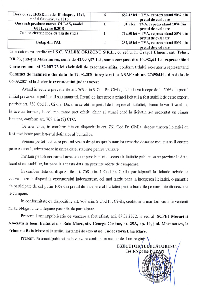 Noi, SOCIETATEA CIVILA PROFESIONALA DE EXECUTORI JUDECATORESTI MORARI SI ASOCIATII, cu sediul in loc. Baia Mare, str. George Cosbuc, nr. 25A, ap. 10, jud. Maramures, prin executor judecatoresc Iosif-Nicoale POPAN,