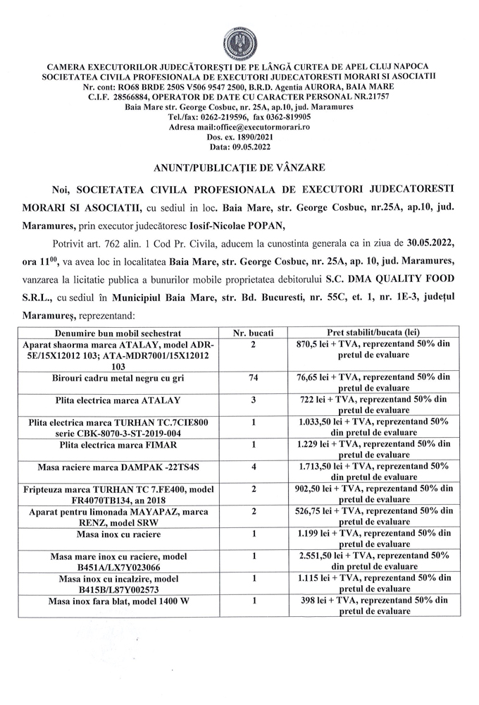 Noi, SOCIETATEA CIVILA PROFESIONALA DE EXECUTORI JUDECATORESTI MORARI SI ASOCIATII, cu sediul in loc. Baia Mare, str. George Cosbuc, nr. 25A, ap. 10, jud. Maramures, prin executor judecatoresc Iosif-Nicoale POPAN,