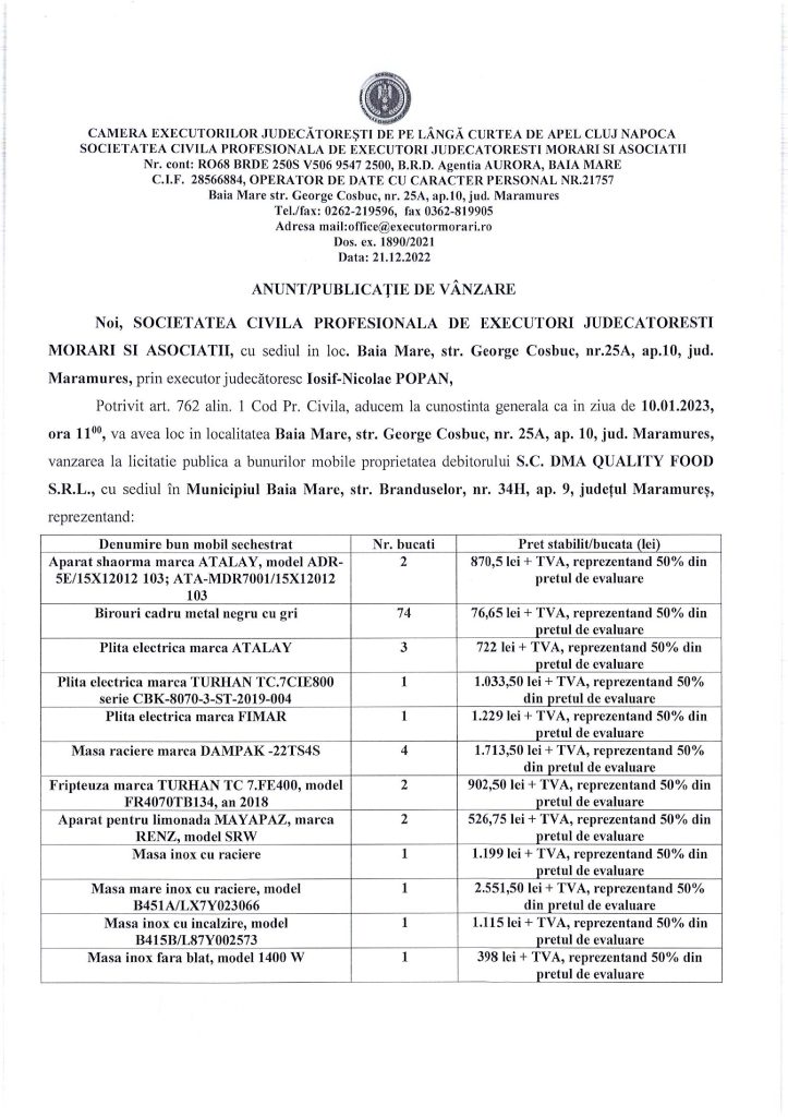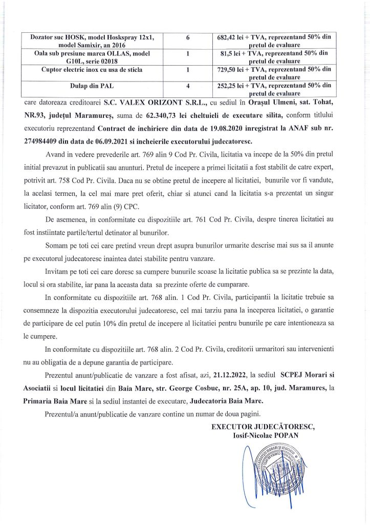 Vânzare diverse bunuri mobile în Baia Mare – Extras publicație mobiliară, din data de 21. 12. 2022