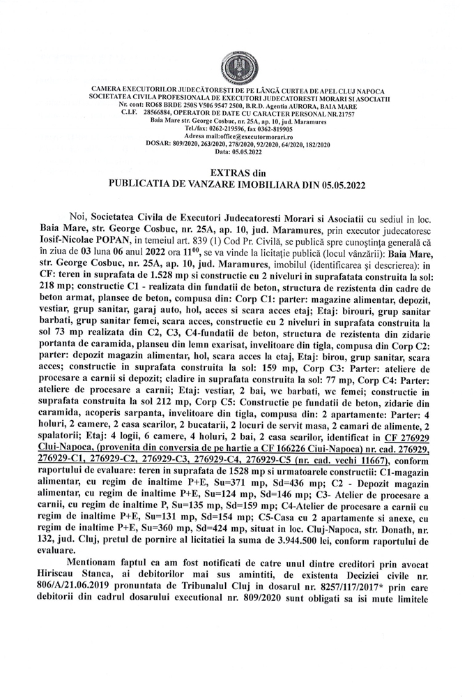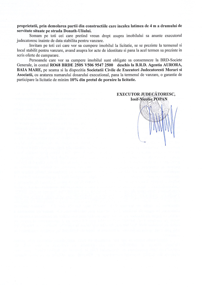 saNoi, Societatea Civilă Profesională de Executori Judecătorești Morari și Asociații cu sediul în loc. Baia Mare, str. George Coșbuc, nr. 25A, ap. 10, jud. Maramureș, prin executor judecătoresc Iosif-Nicolae POPAN în temeiul art. 839 (1) Cod. Pr. Civilă, se publică spre cunoștința generală că în ziua de 03 luna 06 anul 2022 ora 11.00, se va vinde la licitație publică (locul vânzării): Baia Mare, str. George Coșbuc, nr. 25A, ap. 10, jud Maramureș, imobilul descris în documentul de mai jos: