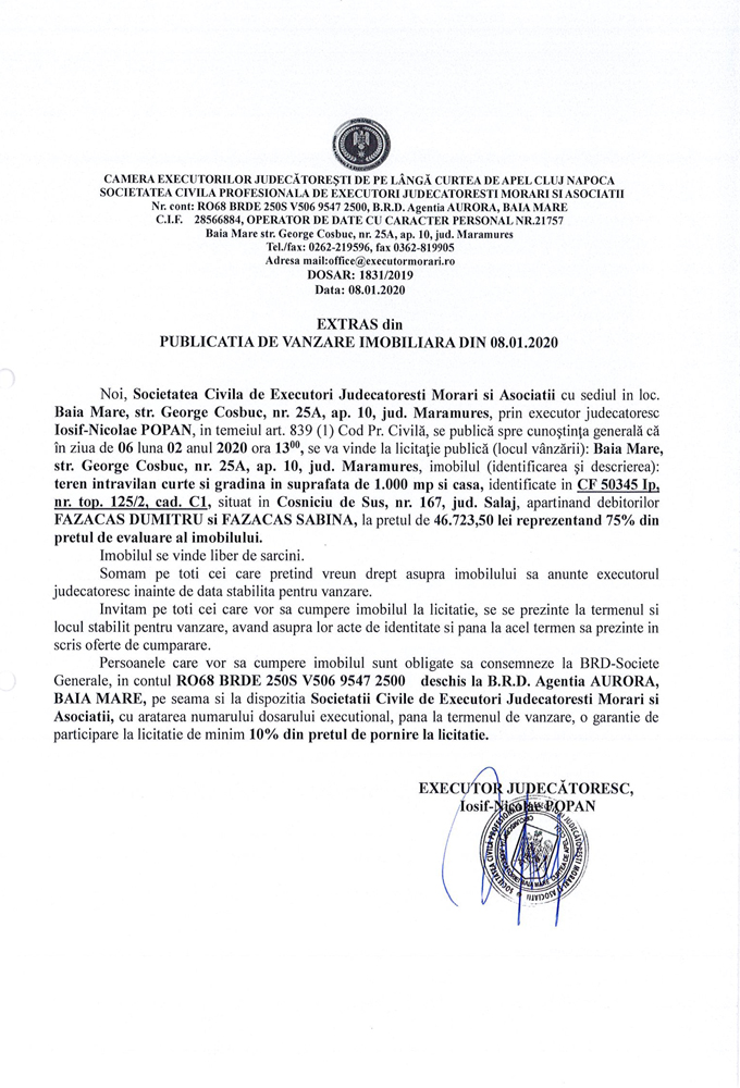 Noi, Societatea Civila Profesionala de Executori Judecatoresti Morari si Asociatii cu sediul in loc. Baia Mare, str. George Cosbuc, nr. 25A, ap. 10, jud. Maramures, prin executor judecatoresc Iosif-Nicolae POPAN, in temeiul art. 839 (1) Cod. Pr. Civila, se publica spre cunostinta generala ca in ziua de 06 luna 02 anul 2020 ora 13.00, se va vinde la licitatie publica (locul vanzarii): Baia Mare, str. George Cosbuc, nr. 25A, ap. 10, jud Maramures, imobilul descris in documentul de mai jos: