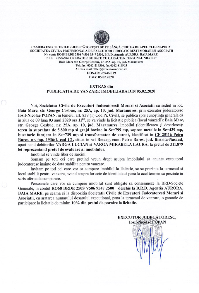 Noi, Societatea Civila Profesionala de Executori Judecatoresti Morari si Asociatii cu sediul in loc. Baia Mare, str. George Cosbuc, nr. 25A, ap. 10, jud. Maramures, prin executor judecatoresc Iosif-Nicolae POPAN, in temeiul art. 839 (1) Cod. Pr. Civila, se publica spre cunostinta generala ca in ziua de 09 luna 03 anul 2020 ora 11.00, se va vinde la licitatie publica (locul vanzarii): Baia Mare, str. George Cosbuc, nr. 25A, ap. 10, jud Maramures, imobilul descris in documentul de mai jos: