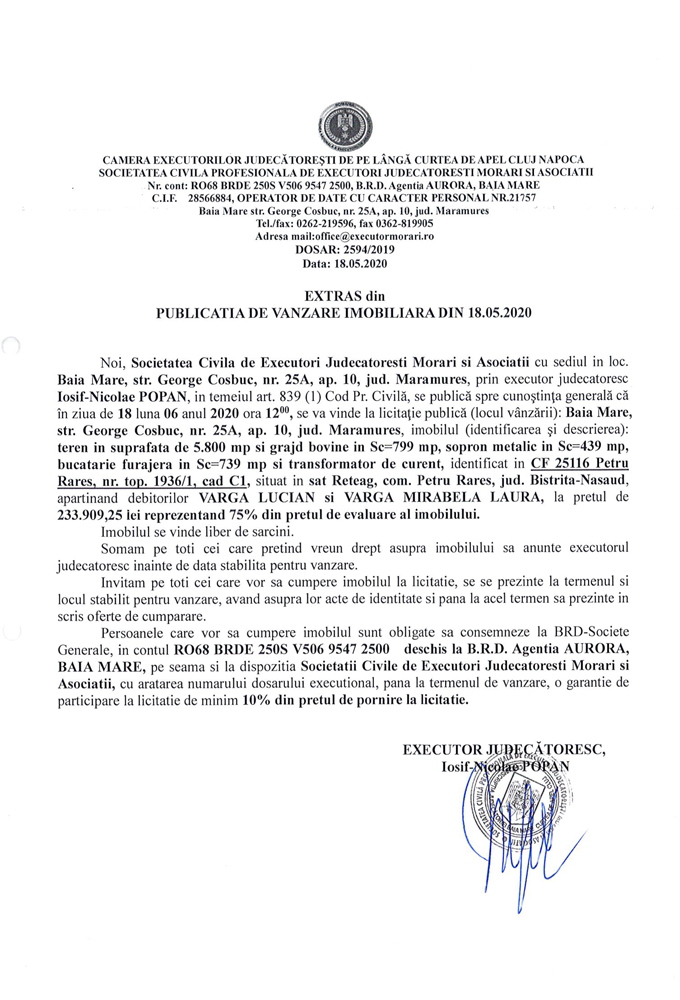 Noi, Societatea Civilă Profesională de Executori Judecătorești Morari și Asociații cu sediul în loc. Baia Mare, str. George Coșbuc, nr. 25A, ap. 10, jud. Maramureș, prin executor judecătoresc Iosif-Nicolae POPAN, în temeiul art. 839 (1) Cod. Pr. Civilă, se publică spre cunoștința generală că în ziua de 18 luna 06 anul 2020 ora 12.00, se va vinde la licitație publică (locul vânzării): Baia Mare, str. George Coșbuc, nr. 25A, ap. 10, jud Maramureș din imobilul descris în documentul de mai jos: