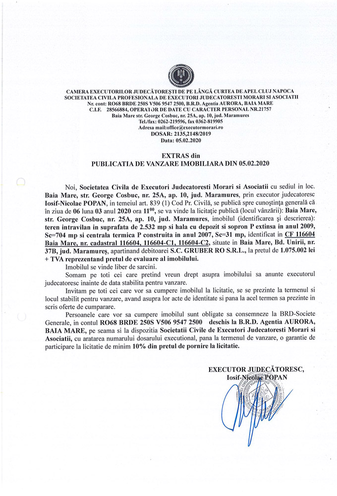 Noi, Societatea Civila Profesionala de Executori Judecatoresti Morari si Asociatii cu sediul in loc. Baia Mare, str. George Cosbuc, nr. 25A, ap. 10, jud. Maramures, prin executor judecatoresc Iosif-Nicolae POPAN, in temeiul art. 839 (1) Cod. Pr. Civila, se publica spre cunostinta generala ca in ziua de 06 luna 03 anul 2020 ora 11.00, se va vinde la licitatie publica (locul vanzarii): Baia Mare, str. George Cosbuc, nr. 25A, ap. 10, jud Maramures, imobilul descris in documentul de mai jos: