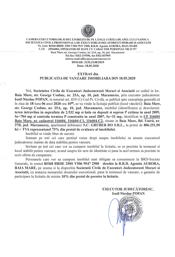 Noi, Societatea Civilă Profesională de Executori Judecătorești Morari și Asociații cu sediul în loc. Baia Mare, str. George Coșbuc, nr. 25A, ap. 10, jud. Maramureș, prin executor judecătoresc Iosif-Nicolae POPAN, în temeiul art. 839 (1) Cod. Pr. Civilă, se publică spre cunoștința generală că în ziua de 18 luna 06 anul 2020 ora 10.00, se va vinde la licitație publică (locul vânzării): Baia Mare, str. George Coșbuc, nr. 25A, ap. 10, jud Maramureș din imobilul descris în documentul de mai jos: