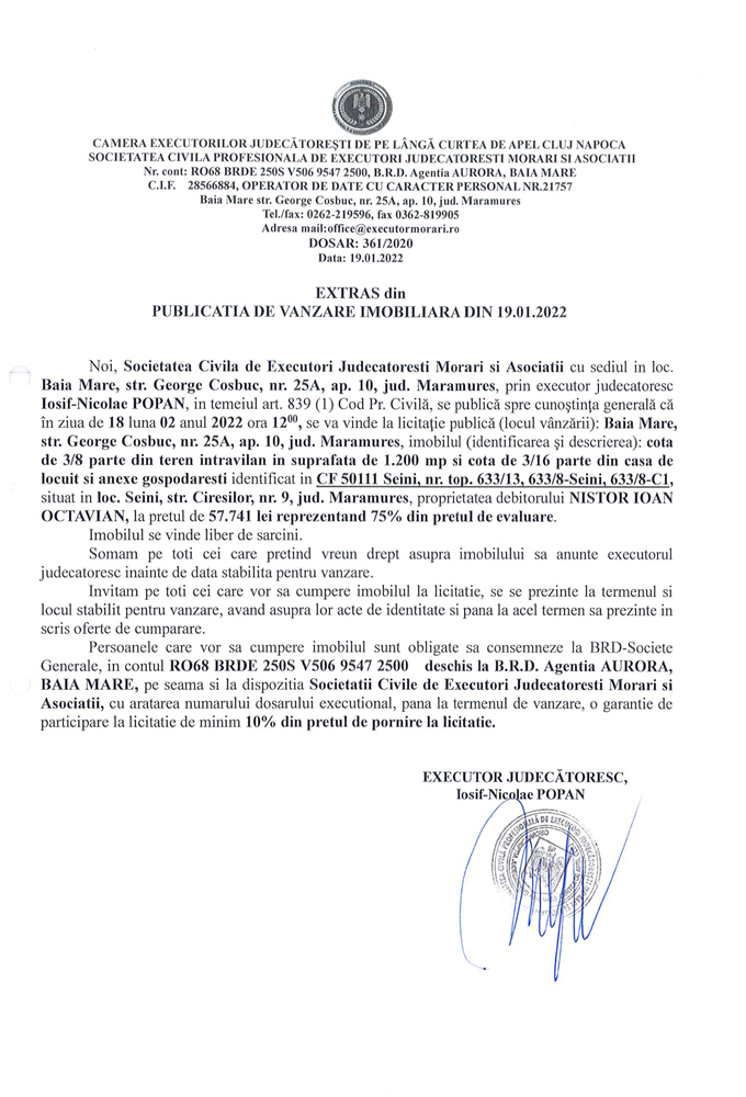 Noi, Societatea Civilă Profesională de Executori Judecătorești Morari și Asociații cu sediul în loc. Baia Mare, str. George Coșbuc, nr. 25A, ap. 10, jud. Maramureș, prin executor judecătoresc Iosif-Nicolae POPAN în temeiul art. 839 (1) Cod. Pr. Civilă, se publică spre cunoștința generală că în ziua de 18 luna 02 anul 2022 ora 12.00, se va vinde la licitație publică (locul vânzării): Baia Mare, str. George Coșbuc, nr. 25A, ap. 10, jud Maramureș, imobilul descris în documentul de mai jos: