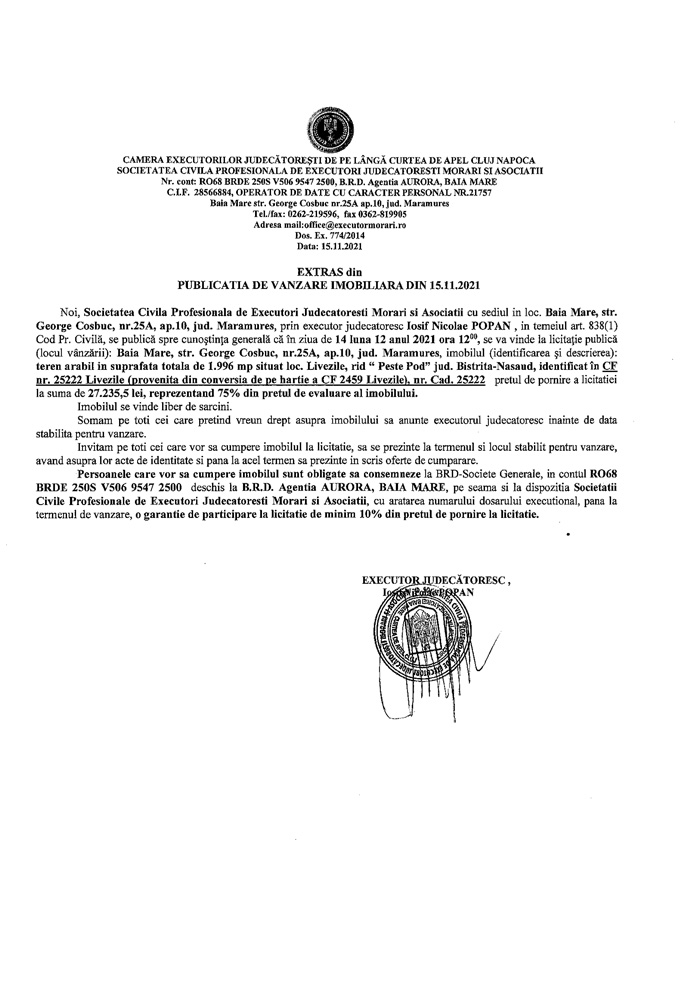Noi, Societatea Civilă Profesională de Executori Judecătorești Morari și Asociații cu sediul în loc. Baia Mare, str. George Coșbuc, nr. 25A, ap. 10, jud. Maramureș, prin executor judecătoresc Iosif Nicolae POPAN în temeiul art. 838(1) Cod. Pr. Civilă, se publică spre cunoștința generală că în ziua de 14 luna 12 anul 2021 ora 12.00, se va vinde la licitație publică (locul vânzării): Baia Mare, str. George Coșbuc, nr. 25A, ap. 10, jud Maramureș, imobilul descris în documentul de mai jos: