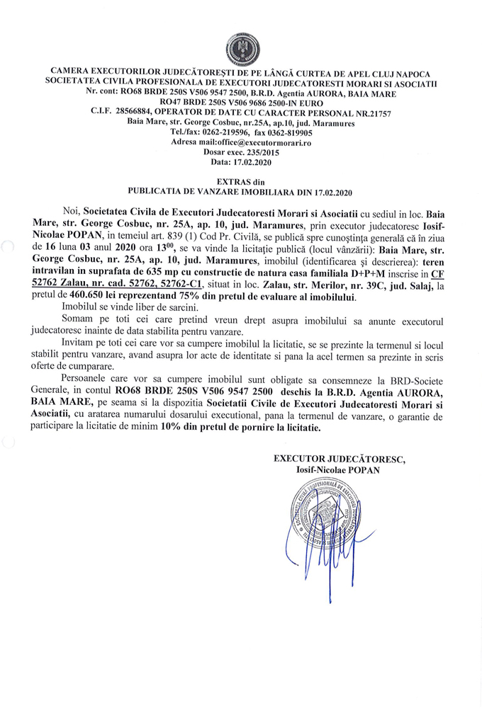 Noi, Societatea Civila Profesionala de Executori Judecatoresti Morari si Asociatii cu sediul in loc. Baia Mare, str. George Cosbuc, nr. 25A, ap. 10, jud. Maramures, prin executor judecatoresc Iosif-Nicolae POPAN, in temeiul art. 838(1) Cod. Pr. Civila, se publica spre cunostinta generala ca in ziua de 16 luna 03 anul 2020 ora 13.00, se va vinde la licitatie publica (locul vanzarii): Baia Mare, str. George Cosbuc, nr. 25A, ap. 10, jud Maramures, imobilul descris in documentul de mai jos: