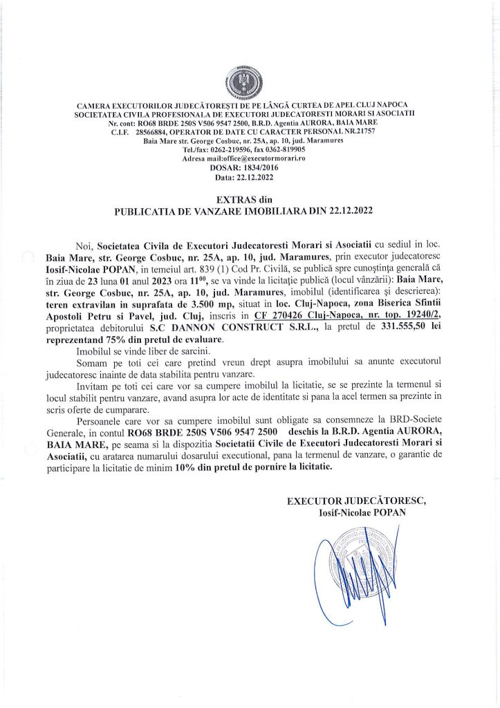 Vânzare teren extravilan în Cluj-Napoca – Extras publicație imobiliară, din data de 22. 12. 2022