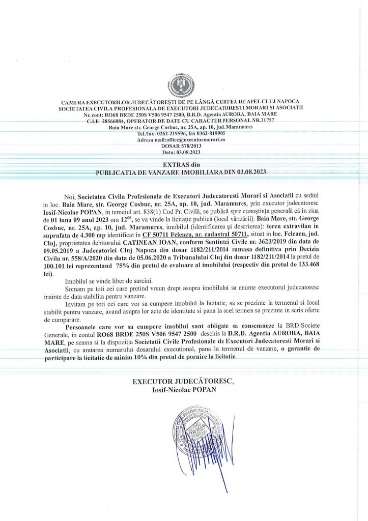 Vânzare teren extravilan în Feleacu, jud. Cluj – Extras publicație imobiliară, din data de 03. 08. 2023
