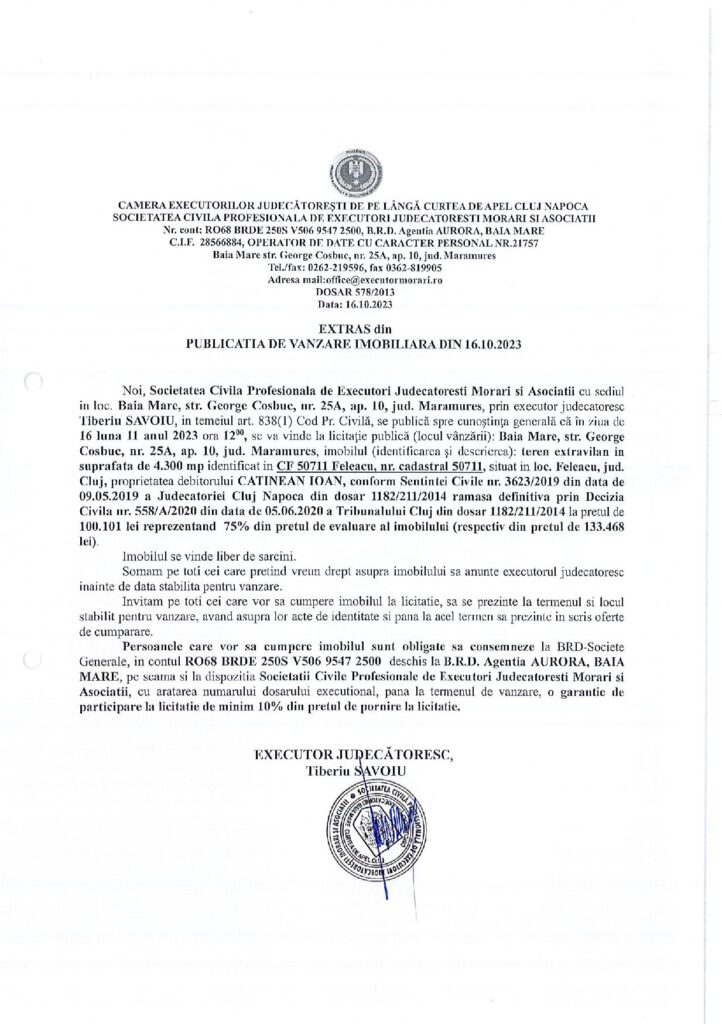 Vânzare teren extravilan în Feleacu, jud. Cluj – Extras publicație imobiliară, din data de 16. 10. 2023