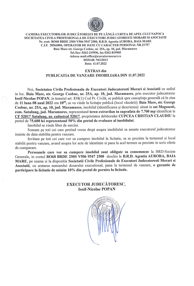 Noi, Societatea Civilă Profesională de Executori Judecătorești Morari și Asociații cu sediul în loc. Baia Mare, str. George Coșbuc, nr. 25A, ap. 10, jud. Maramureș, prin executor judecătoresc Iosif-Nicolae POPAN, în temeiul art. 838(1) Cod. Pr. Civilă, se publică spre cunoștința generală că în ziua de 11 luna 08 anul 2022 ora 10.00, se va vinde la licitație publică (locul vânzării): Baia Mare, str. George Coșbuc, nr. 25A, ap. 10, jud Maramureș, imobilul descris în documentul de mai jos: