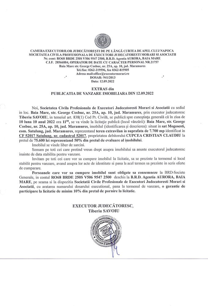 Noi, Societatea Civilă Profesională de Executori Judecătorești Morari și Asociații cu sediul în loc. Baia Mare, str. George Coșbuc, nr. 25A, ap. 10, jud. Maramureș, prin executor judecătoresc Tiberiu SĂVOIU, în temeiul art. 838(1) Cod. Pr. Civilă, se publică spre cunoștința generală că în ziua de 10 luna 10 anul 2022 ora 11.00, se va vinde la licitație publică (locul vânzării): Baia Mare, str. George Coșbuc, nr. 25A, ap. 10, jud Maramureș, imobilul descris în documentul de mai jos: