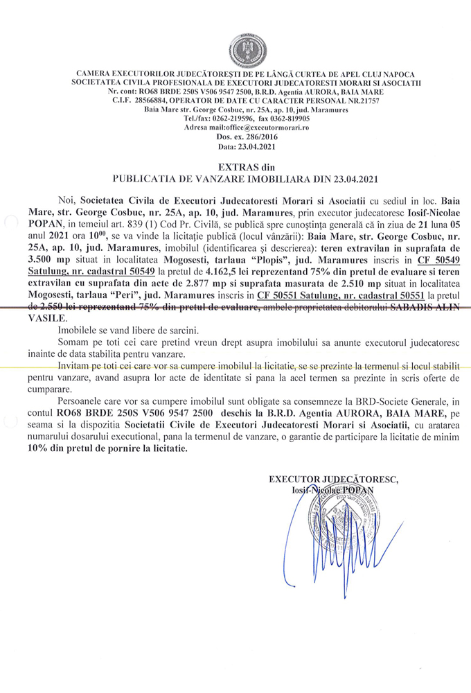 Noi, Societatea Civilă Profesională de Executori Judecătorești Morari și Asociații cu sediul în loc. Baia Mare, str. George Coșbuc, nr. 25A, ap. 10, jud. Maramureș, prin executor judecătoresc Iosif-Nicolae POPAN în temeiul art. 839 (1) Cod. Pr. Civilă, se publică spre cunoștința generală că în ziua de 21 luna 05 anul 2021 ora 10.00 se va vinde la licitație publică (locul vânzării): Baia Mare, str. George Coșbuc, nr. 25A, ap. 10, jud Maramureș din imobilul descris în documentul de mai jos: