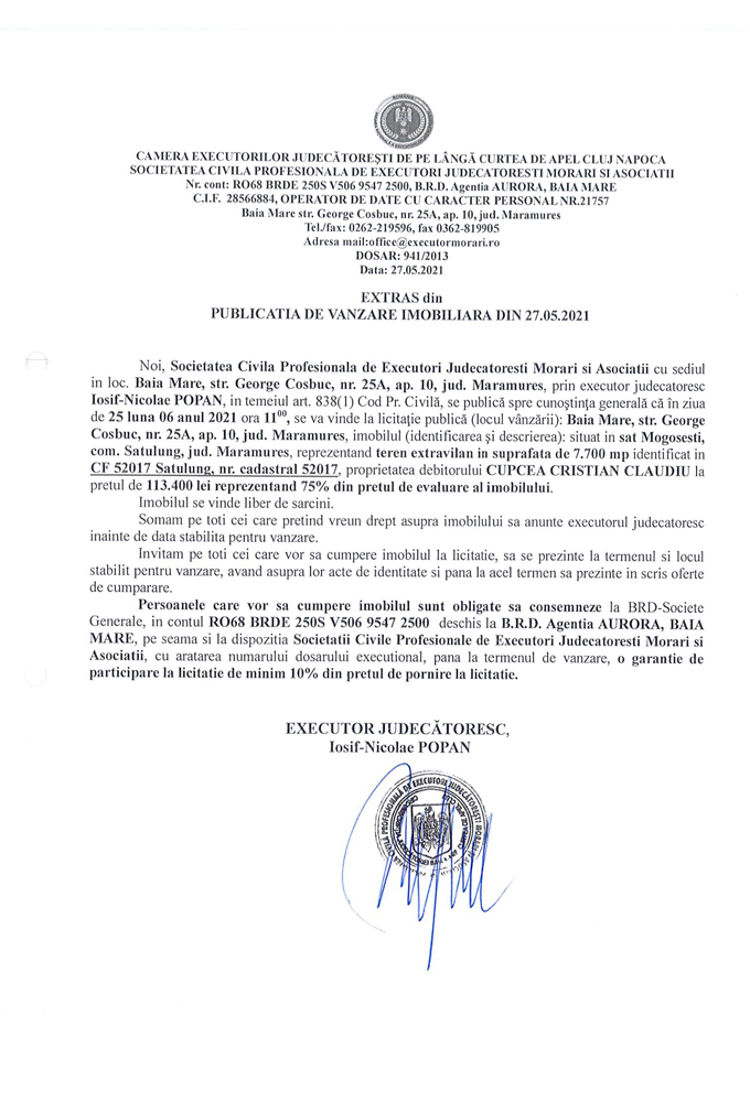 Noi, Societatea Civilă Profesională de Executori Judecătorești Morari și Asociații cu sediul în loc. Baia Mare, str. George Coșbuc, nr. 25A, ap. 10, jud. Maramureș, prin executor judecătoresc Iosif-Nicolae POPAN în temeiul art. 838(1) Cod. Pr. Civilă, se publică spre cunoștința generală că în ziua de 25 luna 06 anul 2021 ora 11.00 se va vinde la licitație publică (locul vânzării): Baia Mare, str. George Coșbuc, nr. 25A, ap. 10, jud Maramureș imobilul descris în documentul de mai jos: