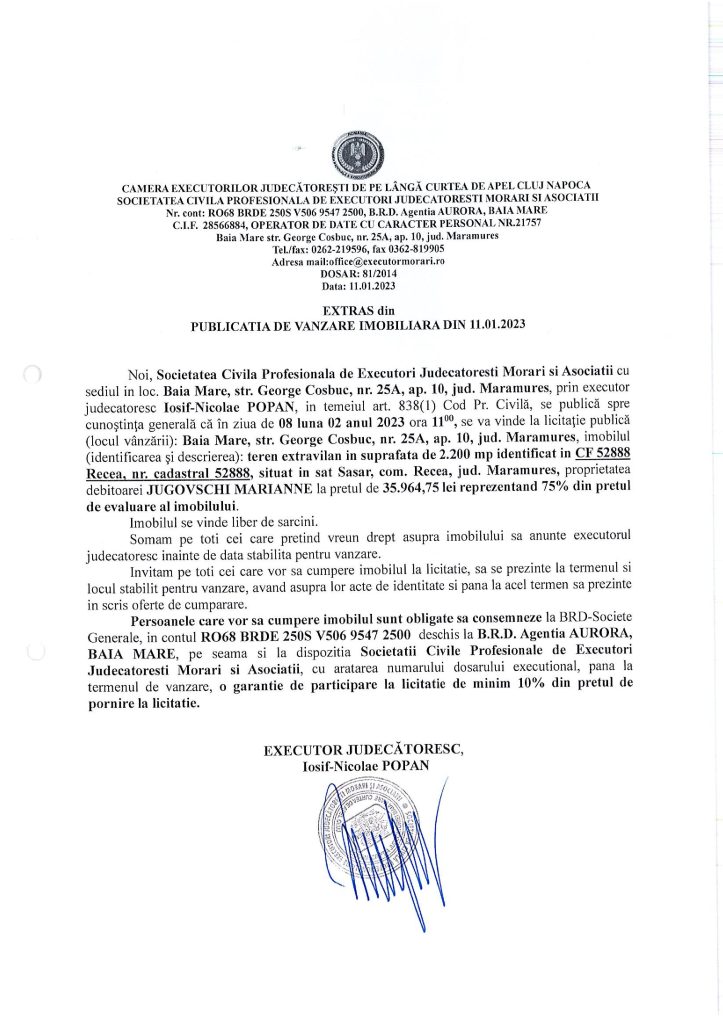 Vânzare teren extravilan în Recea – Extras publicație imobiliară, din data de 11. 01. 2023