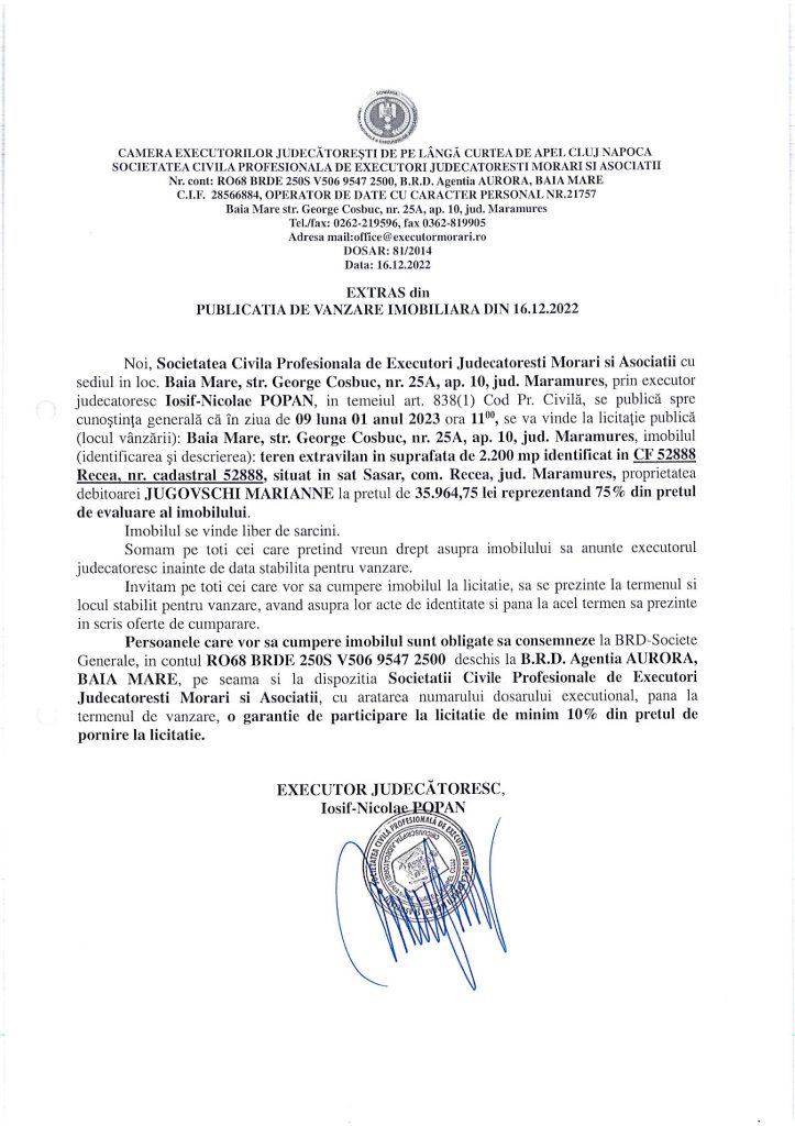 Vânzare teren extravilan în Săsar – Extras publicație imobiliară, din data de 16. 12. 2022