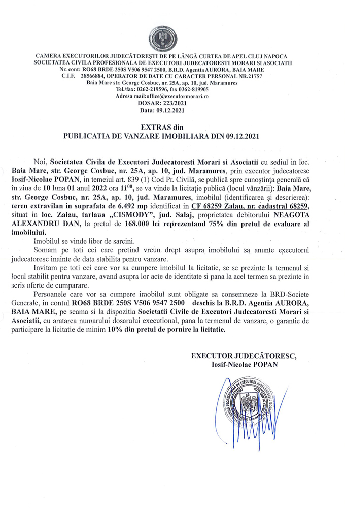 Noi, Societatea Civilă Profesională de Executori Judecătorești Morari și Asociații cu sediul în loc. Baia Mare, str. George Coșbuc, nr. 25A, ap. 10, jud. Maramureș, prin executor judecătoresc Iosif-Nicolae POPAN în temeiul art. 839 (1) Cod. Pr. Civilă, se publică spre cunoștința generală că în ziua de 10 luna 01 anul 2022 ora 11.00, se va vinde la licitație publică (locul vânzării): Baia Mare, str. George Coșbuc, nr. 25A, ap. 10, jud Maramureș, imobilul descris în documentul de mai jos: