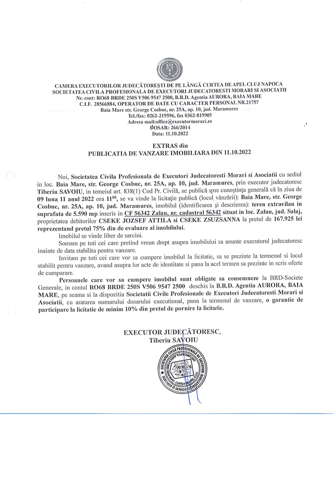 Noi, Societatea Civilă Profesională de Executori Judecătorești Morari și Asociații cu sediul în loc. Baia Mare, str. George Coșbuc, nr. 25A, ap. 10, jud. Maramureș, prin executor judecătoresc Tiberiu SĂVOIU, în temeiul art. 838(1) Cod. Pr. Civilă, se publică spre cunoștința generală că în ziua de 09 luna 11 anul 2022 ora 11.00, se va vinde la licitație publică (locul vânzării): Baia Mare, str. George Coșbuc, nr. 25A, ap. 10, jud Maramureș, imobilul descris în documentul de mai jos: