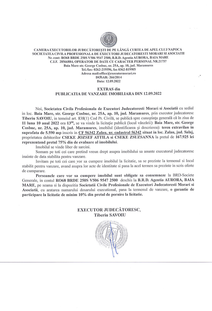Noi, Societatea Civilă Profesională de Executori Judecătorești Morari și Asociații cu sediul în loc. Baia Mare, str. George Coșbuc, nr. 25A, ap. 10, jud. Maramureș, prin executor judecătoresc Tiberiu SĂVOIU, în temeiul art. 838(1) Cod. Pr. Civilă, se publică spre cunoștința generală că în ziua de 11 luna 10 anul 2022 ora 13.00, se va vinde la licitație publică (locul vânzării): Baia Mare, str. George Coșbuc, nr. 25A, ap. 10, jud Maramureș, imobilul descris în documentul de mai jos: