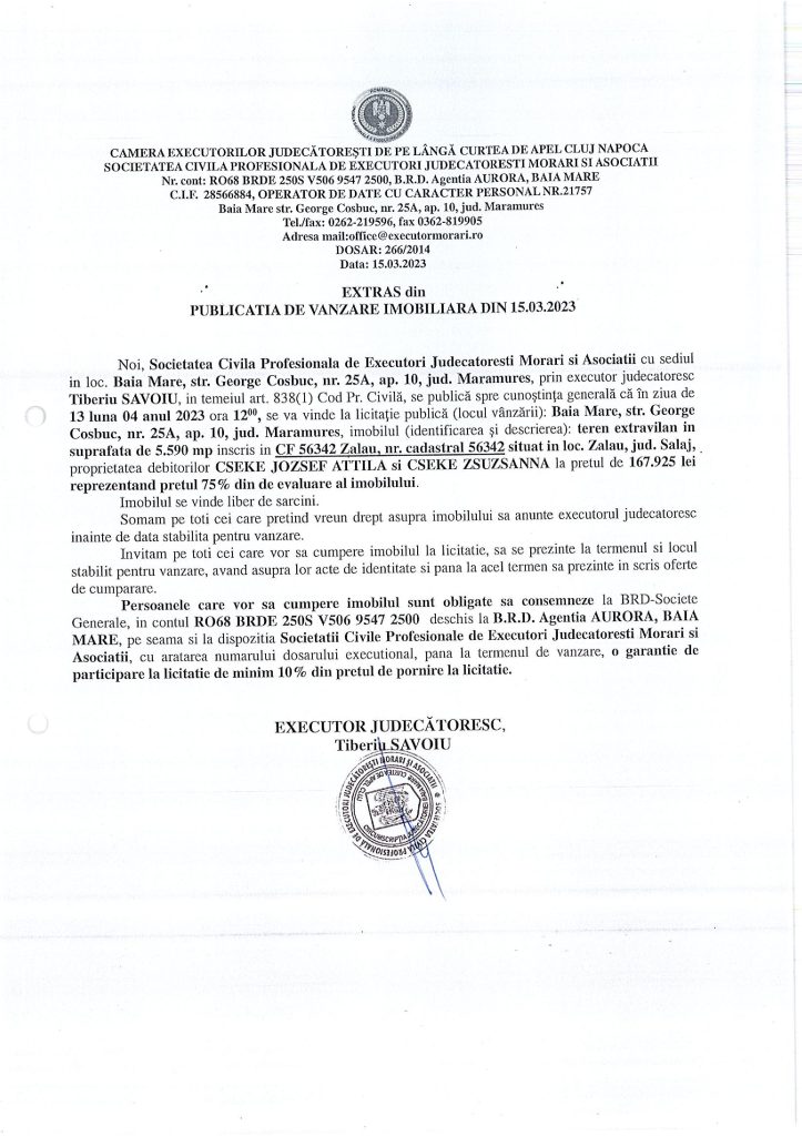 Vânzare teren extravilan în Zalău – Extras publicatie imobiliara, din data de 15. 03. 2023