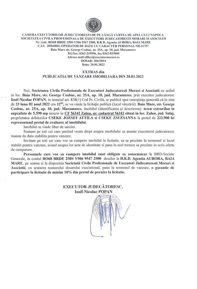 Noi, Societatea Civilă Profesională de Executori Judecătorești Morari și Asociații cu sediul în loc. Baia Mare, str. George Coșbuc, nr. 25A, ap. 10, jud. Maramureș, prin executor judecătoresc Iosif-Nicolae POPAN în temeiul art. 838(1) Cod. Pr. Civilă, se publică spre cunoștința generală că în ziua de 23 luna 02 anul 2022 ora 12.00, se va vinde la licitație publică (locul vânzării): Baia Mare, str. George Coșbuc, nr. 25A, ap. 10, jud Maramureș, imobilul descris în documentul de mai jos: