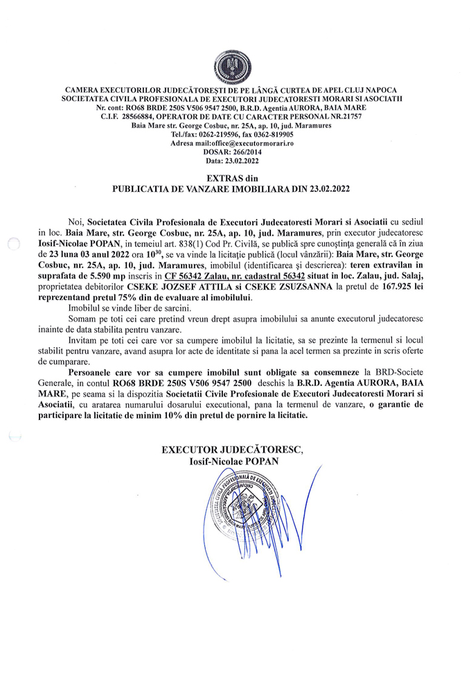 Noi, Societatea Civilă Profesională de Executori Judecătorești Morari și Asociații cu sediul în loc. Baia Mare, str. George Coșbuc, nr. 25A, ap. 10, jud. Maramureș, prin executor judecătoresc Iosif-Nicolae POPAN în temeiul art. 838(1) Cod. Pr. Civilă, se publică spre cunoștința generală că în ziua de 23 luna 03 anul 2022 ora 10.30, se va vinde la licitație publică (locul vânzării): Baia Mare, str. George Coșbuc, nr. 25A, ap. 10, jud Maramureș, imobilul descris în documentul de mai jos: