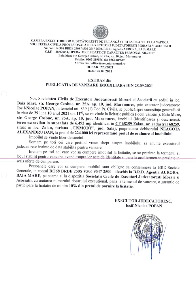 nNoi, Societatea Civilă Profesională de Executori Judecătorești Morari și Asociații cu sediul în loc. Baia Mare, str. George Coșbuc, nr. 25A, ap. 10, jud. Maramureș, prin executor judecătoresc Iosif-Nicolae POPAN în temeiul art. 839 (1) Cod. Pr. Civilă, se publică spre cunoștința generală că în ziua de 29 luna 10 anul 2021 ora 11.00, se va vinde la licitație publică (locul vânzării): Baia Mare, str. George Coșbuc, nr. 25A, ap. 10, jud Maramureș imobilul descris în documentul de mai jos: