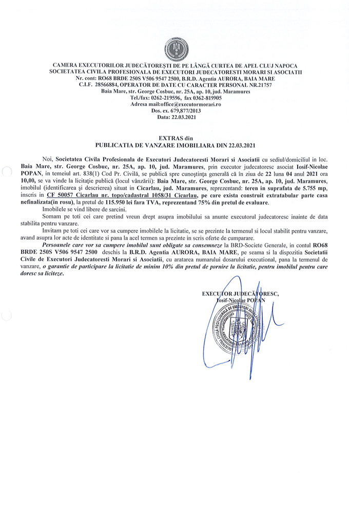 Noi, Societatea Civilă Profesională de Executori Judecătorești Morari și Asociații cu sediul/domiciliul în loc. Baia Mare, str. George Coșbuc, nr. 25A, ap. 10, jud. Maramureș, prin executor judecătoresc asociat Iosif Nicolae POPAN în temeiul art. 838(1) Cod. Pr. Civilă, se publică spre cunoștința generală că în ziua de 22 luna 04 anul 2021 ora 10,00 se va vinde la licitație publică (locul vânzării): Baia Mare, str. George Coșbuc, nr. 25A, ap. 10, jud Maramureș din imobilul descris în documentul de mai jos: