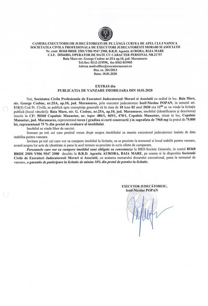 Noi, Societatea Civila Profesionala de Executori Judecatoresti Morari si Asociatii cu sediul in loc. Baia Mare, str. George Cosbuc, nr. 25A, ap. 10, jud. Maramures, prin executor judecatoresc Iosif-Nicolae POPAN, in temeiul art. 838(4) Cod. Pr. Civila, se publica spre cunostinta generala ca in ziua de 10 luna 02 anul 2020 ora 11.00, se va vinde la licitatie publica (locul vanzarii): Baia Mare, str. George Cosbuc, nr. 25A, ap. 10, jud Maramures, imobilul descris in documentul de mai jos: