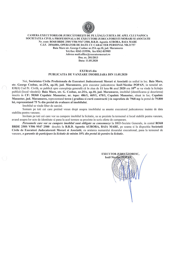 Noi, Societatea Civilă Profesională de Executori Judecătorești Morari și Asociații cu sediul în loc. Baia Mare, str. George Coșbuc, nr. 25A, ap. 10, jud. Maramureș, prin executor judecătoresc Iosif-Nicolae POPAN, în temeiul art. 838(4) Cod. Pr. Civilă, se publică spre cunoștința generală că în ziua de 11 luna 06 anul 2020 ora 10.00, se va vinde la licitație publică (locul vânzării): Baia Mare, str. George Coșbuc, nr. 25A, ap. 10, jud Maramureș din imobilul descris în documentul de mai jos:
