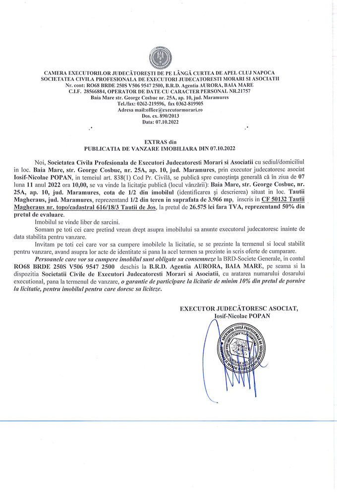 Noi, Societatea Civilă Profesională de Executori Judecătorești Morari și Asociații cu sediul/domiciliul în loc. Baia Mare, str. George Coșbuc, nr. 25A, ap. 10, jud. Maramureș, prin executor judecătoresc asociat Iosif-Nicolae POPAN, în temeiul art. 838(1) Cod. Pr. Civilă, se publică spre cunoștința generală că în ziua de 07 luna 11 anul 2022 ora 10,00, se va vinde la licitație publică (locul vânzării): Baia Mare, str. George Coșbuc, nr. 25A, ap. 10, jud Maramureș, imobilul descris în documentul de mai jos: