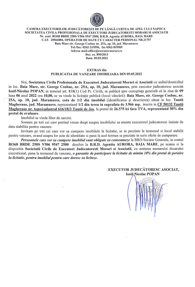 Noi, Societatea Civilă Profesională de Executori Judecătorești Morari și Asociații cu sediul/domiciliul în loc. Baia Mare, str. George Coșbuc, nr. 25A, ap. 10, jud. Maramureș, prin executor judecătoresc asociat Iosif-Nicolae POPAN în temeiul art. 838(1) Cod. Pr. Civilă, se publică spre cunoștința generală că în ziua de 09 luna 06 anul 2022 ora 10,00, se va vinde la licitație publică (locul vânzării): Baia Mare, str. George Coșbuc, nr. 25A, ap. 10, jud Maramureș, imobilul descris în documentul de mai jos: