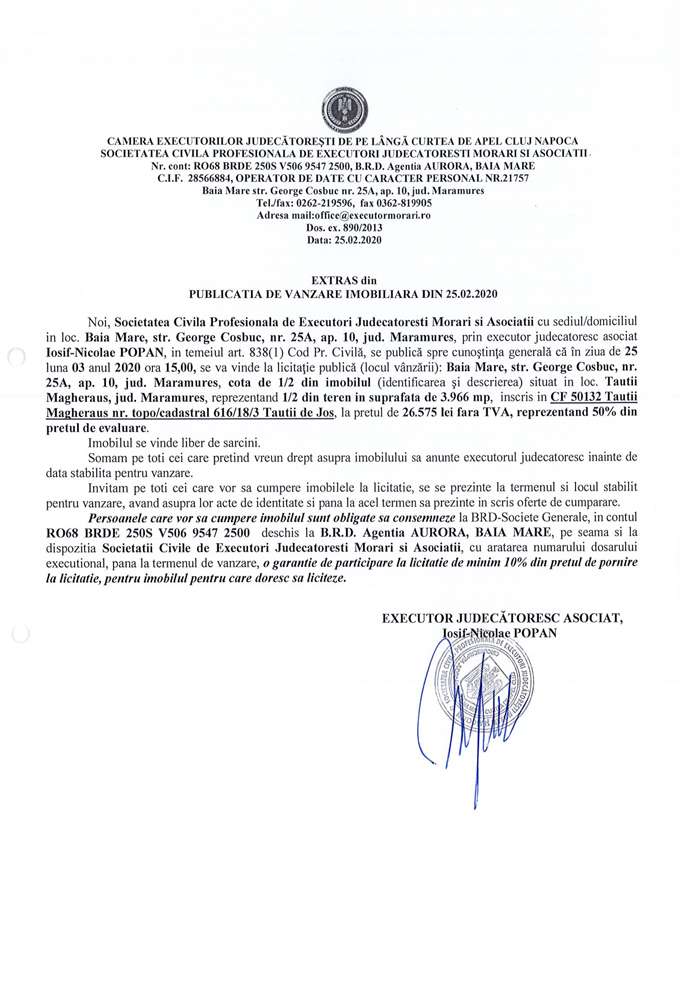 Noi, Societatea Civila Profesionala de Executori Judecatoresti Morari si Asociatii cu sediul/domiciliul in loc. Baia Mare, str. George Cosbuc, nr. 25A, ap. 10, jud. Maramures, prin executor judecatoresc asociat Iosif-Nicolae POPAN, in temeiul art. 838(1) Cod. Pr. Civila, se publica spre cunostinta generala ca in ziua de 25 luna 03 anul 2020 ora 15,00, se va vinde la licitatie publica (locul vanzarii): Baia Mare, str. George Cosbuc, nr. 25A, ap. 10, jud Maramures, cota de 1/2 din imobilul descris in documentul de mai jos: